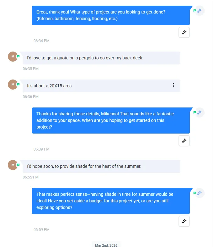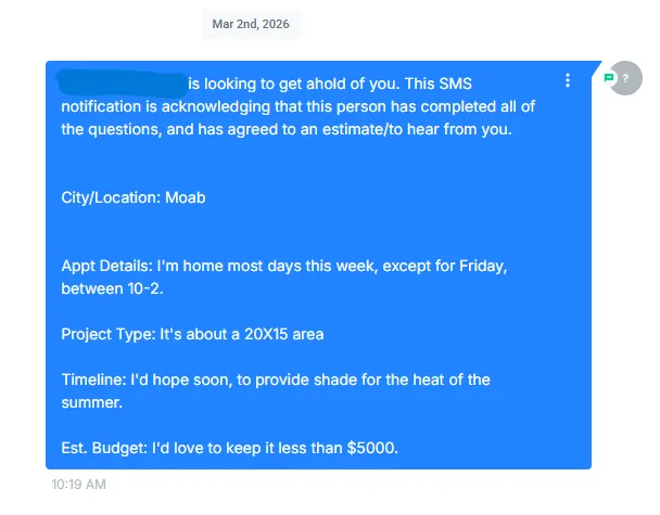 Most leads go cold because you’re too busy on-site to chase them. Our SmartQuote System starts the conversation the second someone clicks your ad — asking about the project, timeline, and budget — and keeps following up until they’re ready to quote.